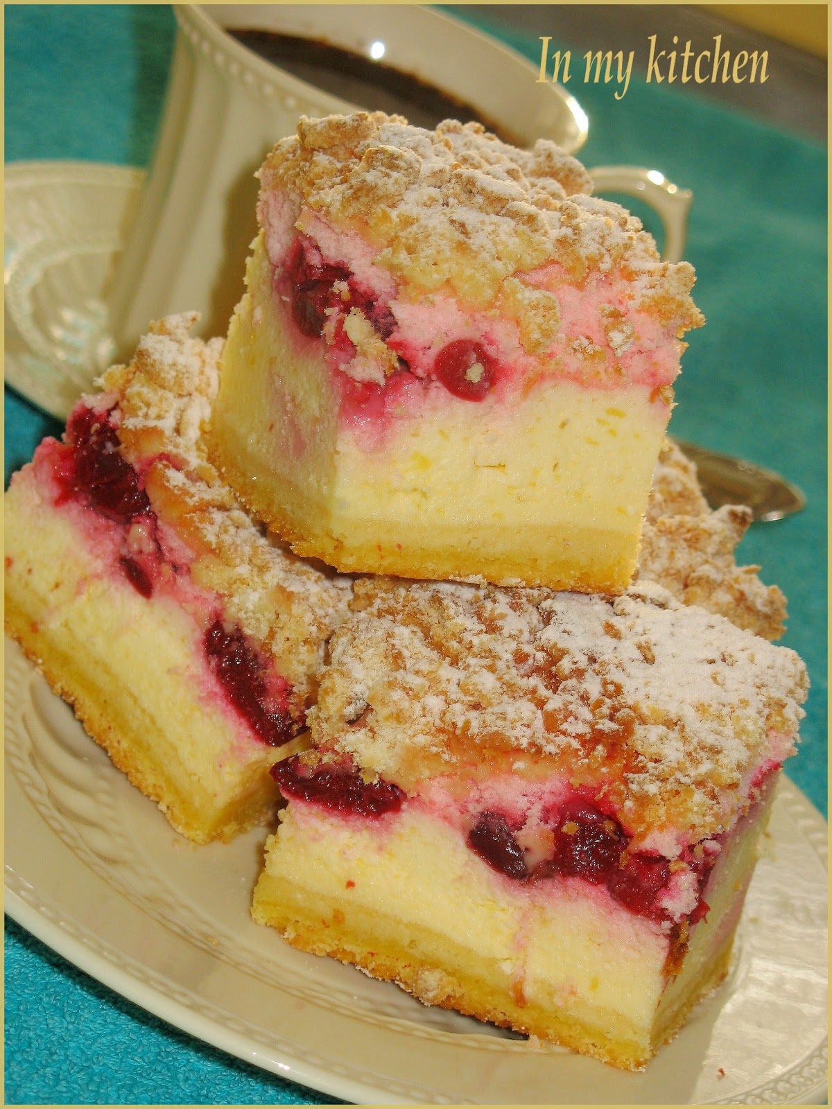 Delikatnie przelać masę na przygotowany spód. Piec przez 45-50 minut w 160 st.C. Ciasto jest gotowe, gdy wciąż drży w środku.